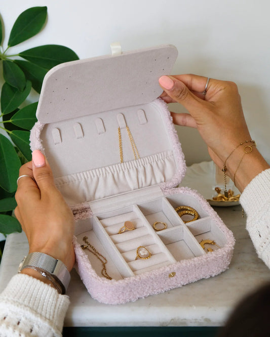 Boîte à bijoux de voyage Brigitte en moumoute rose