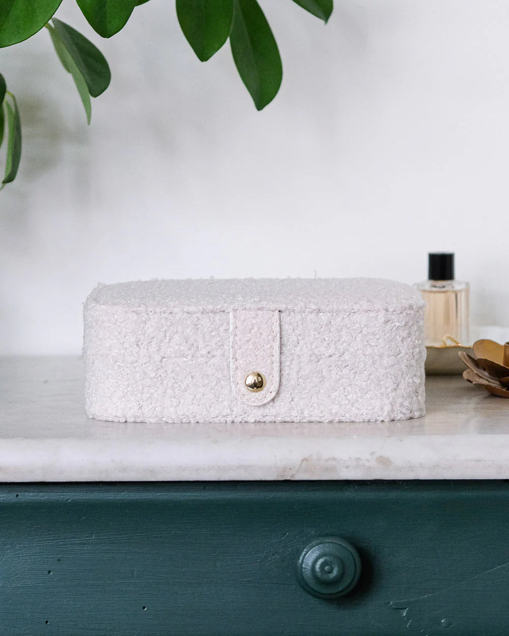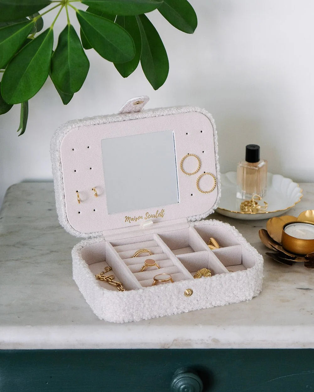 Brigitte en moumoute est la plus grande boîte à bijoux de voyage de notre collection, pensée pour celles qui aiment emporter une belle sélection de bijoux partout avec elles. Sa texture toute douce, façon moumoute, lui donne un charme irrésistible, tandis que sa forme compacte se glisse facilement dans une valise, un sac 48h ou un tote bag.