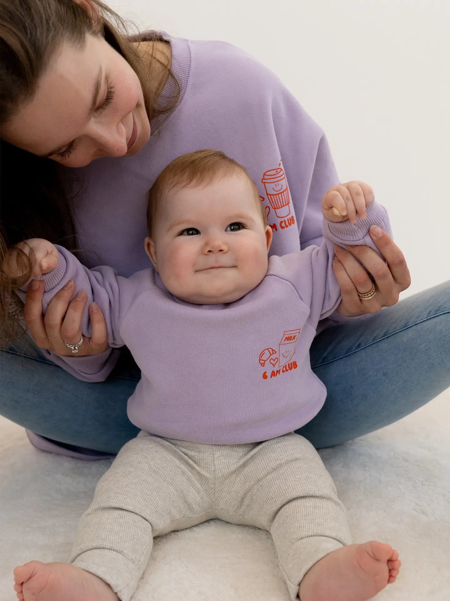 Bienvenue au Club 6h ! Ce sweatshirt lilas tout doux est orné d’un imprimé craquant représentant une brique de lait, un croissant et de petits cœurs, accompagné de l’inscription « Club 6h » en orange.