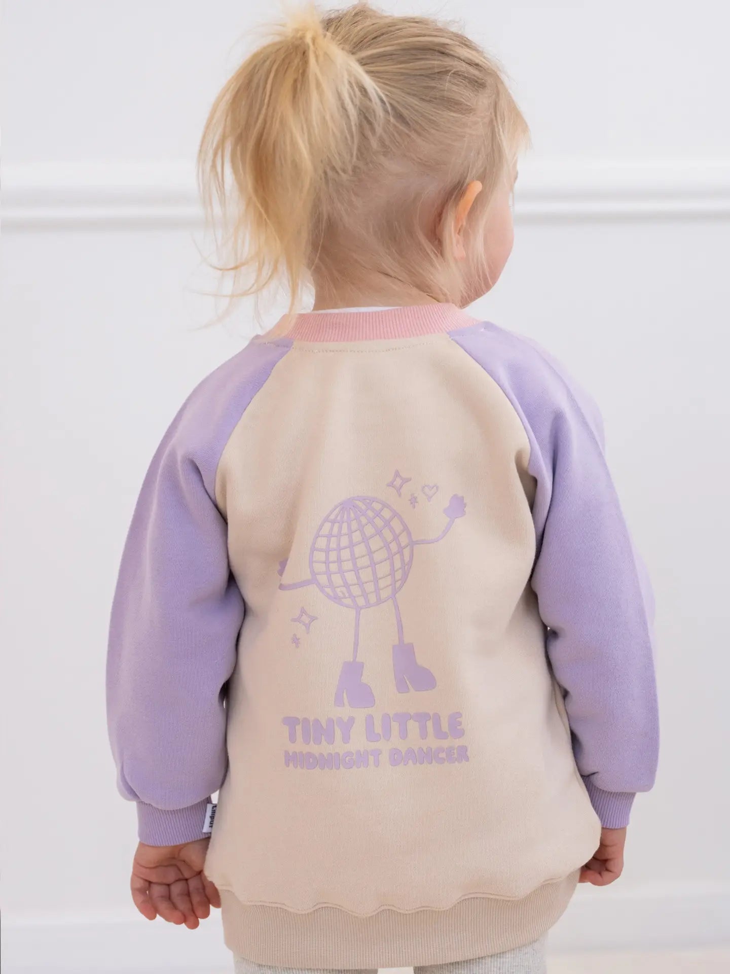 Ă lâavant, une Ă©toile joyeuse semble danser, tandis quâĂ lâarriĂšre, une petite boule Ă facettes brille sous le message tendre « Tiny Little Midnight Dancer ».